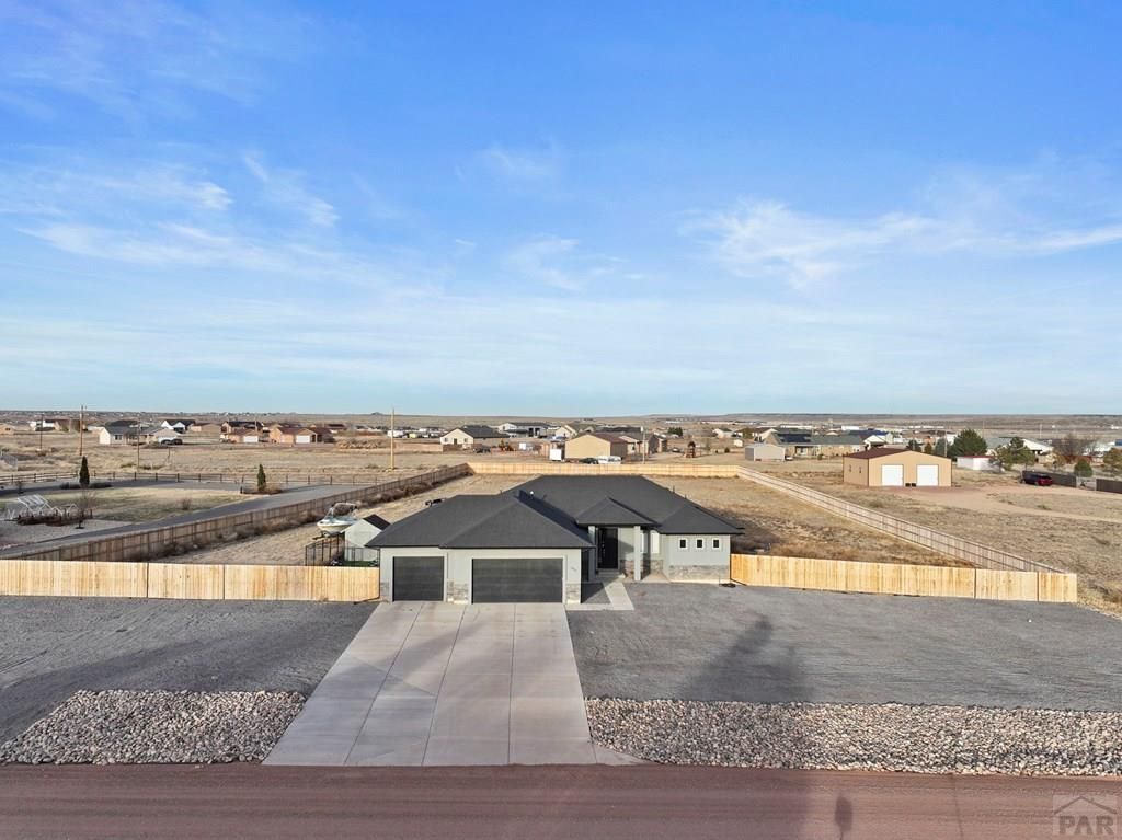 Beautiful ranch-style home in Pueblo West! Situated on 1.29 acres, this 3-bedroom, 2-bath home with a 3-car garage offers modern design and open-concept living. Step inside to vaulted ceilings and a bright, spacious layout. Luxury vinyl tile flows throughout the living, dining, and kitchen areas, creating a seamless and stylish feel. The kitchen features stainless steel appliances, granite countertops, tile flooring, and a pantry for added storage. The spacious primary suite includes a large ensuite bath with dual vanities and a walk-in closet. Two additional bedrooms share a full bath, providing comfort and functionality. Enjoy Colorado evenings from the covered back porch overlooking the fully fenced backyard. The front yard features low-maintenance landscaping, giving you more time to relax and enjoy your space.