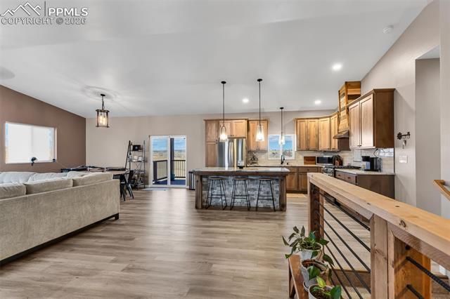 Trade crowded neighborhoods for open skies and room to roam with this beautiful 3,360 sq ft, 4-bedroom, 3-bath ranch-style home on 5 tranquil acres just outside the city. Inside, rustic comfort meets modern rhythm under vaulted ceilings and luxury vinyl plank floors built for real life. The open main level revolves around a granite-topped kitchen and island—where stories are shared and meals begin—opening into a fireplace-warmed living room and out onto a walkout deck that turns ordinary mornings and ordinary evenings into small daily rituals. Down the hall, the primary suite is its own quiet escape, complete with a private deck and a spa-inspired five-piece bath—an easy place to reset at the end of the day. A second bedroom and full bathroom on the main level offer comfort and convenience. The fully finished walkout basement introduces a secondary living area with a wet bar & family room, offering a natural extension of the home for entertaining or unwinding. Two additional bedrooms and a full bathroom create versatile options for workspaces, studios, or multi-generational living. Built in 2023, this home delivers confidence in its major systems and roof, so you can focus on enjoying the lifestyle it offers. Outside, experience quieter days, darker night skies, and the escape from suburban sprawl—all while still being just a short drive from town conveniences. Zoned for horses and livestock, this property offers more than just space — it promises room for animals, wide-open views, and the timeless reward of owning your own slice of land.