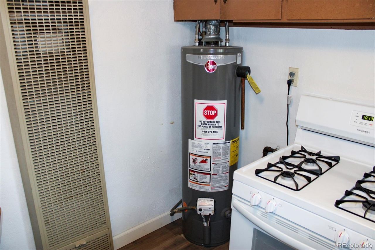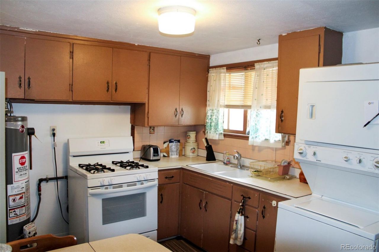 This one-bedroom, one-bath ranch-style home offers efficient living with a practical layout and flexible use of space. The dine-in kitchen includes a gas range, refrigerator, and stackable washer and dryer, with room for a small table. The living area features warm wood-paneled walls and a ceiling fan for comfort. For those looking to reconfigure the layout, the living room could easily serve as a bedroom, with the existing bedroom converted into a large walk-in closet or home office. The updated 3/4 bath includes a walk-in shower, and built-in cabinetry throughout the home provides additional storage. Outside, the fenced yard includes grass, mature trees, and two outbuildings, a storage shed and a separate workshop thats ideal for projects, crafts, or extra storage. The covered front porch offers a shaded spot to relax and enjoy the evening breeze, while the large gravel area provides plenty of off-street parking. Located near parks, schools, shopping, and I-25 access, this property is a great option for a homeowner or investor looking for an affordable home with creative potential and convenient access to amenities.