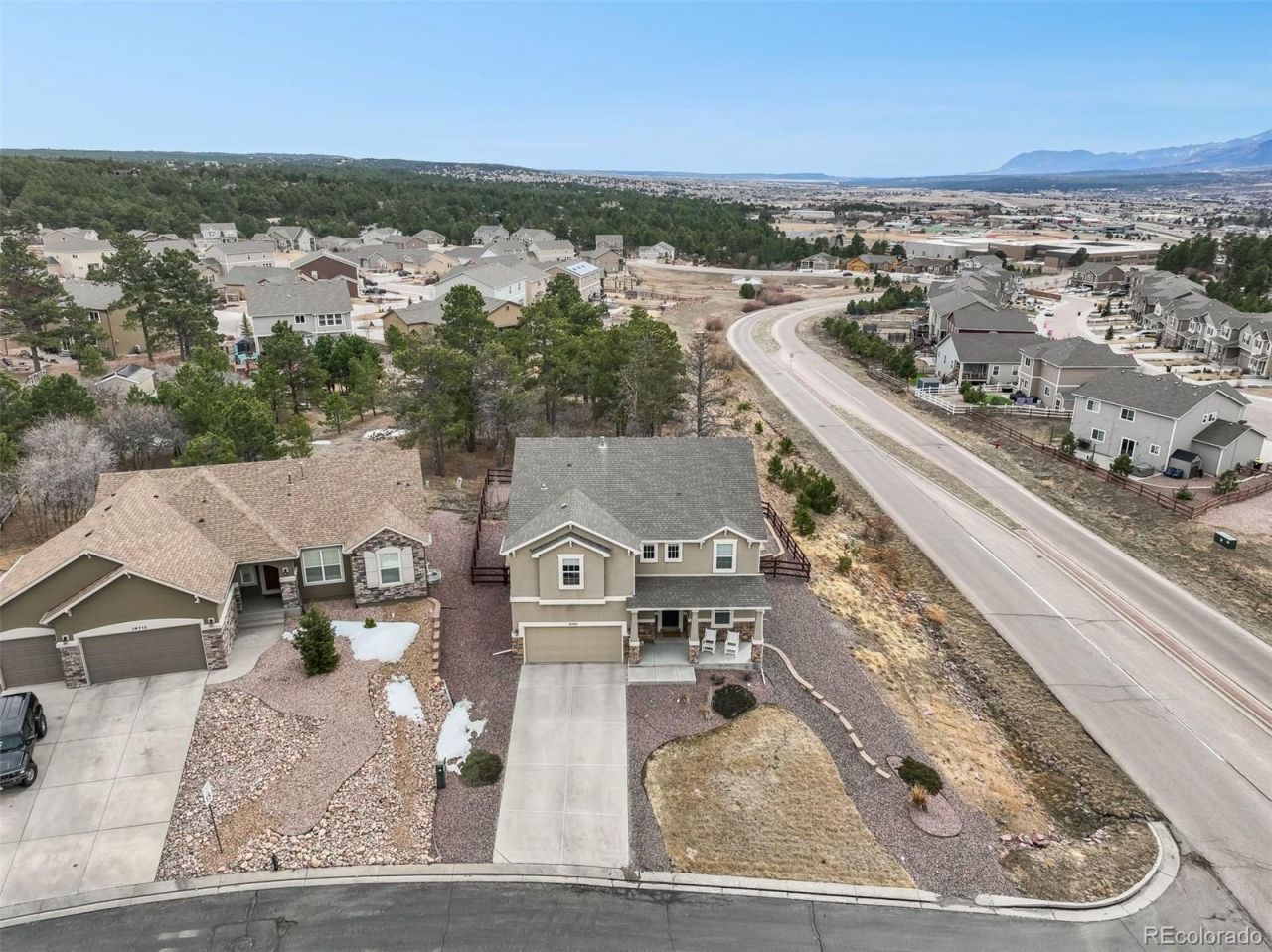 Experience Colorado luxury living in this beautiful 5 bedroom, 4 bathroom home in the highly desirable Misty Acres neighborhood of Monument, Colorado, located in top rated Lewis Palmer School District 38. This thoughtfully designed two story stucco home offers stunning, unobstructed views of Pikes Peak and the Front Range while providing comfort, style, and everyday livability.Inside, the open floor plan features hardwood floors, upgraded carpet, and designer tile finishes throughout. The gourmet kitchen showcases stainless steel appliances, double wall ovens, solid granite countertops, a large walk in pantry, and a gas ready cooktop, making it perfect for both cooking and entertaining. The formal dining area flows seamlessly to a covered outdoor patio through French doors, creating an ideal space to enjoy Colorado sunrises and sunsets year round.A main level office provides a private workspace, ideal for remote professionals or a quiet study area. Upstairs, the spacious primary suite offers a peaceful retreat with French doors, a spa inspired bathroom, and an oversized walk in closet. Three additional bedrooms, a roomy loft, a full bathroom, and a conveniently located upper level laundry room complete the second floor.The fully finished basement adds even more living space with a large family or media room, an additional bedroom and bathroom, plus ample storage, making it ideal for guests, recreation, or multigenerational living.Situated on a premium lot backing to open space, this home provides privacy and natural beauty. The fully fenced backyard includes mature pines, scrub oak, a cozy wood burning fire pit, and a full sprinkler system. The front yard blends lush grass with low maintenance xeriscape landscaping for attractive curb appeal in every season.Located just minutes from Monument shopping, dining, parks, and easy access to I 25, this home offers the perfect combination of luxury, convenience, and breathtaking mountain views.