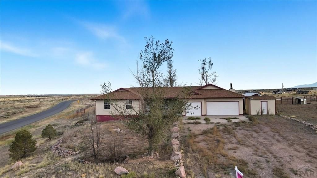 ranch-style home situated on a 2-acre horse property in Pueblo West. Breathtaking mountain views enhance the appeal of this property. Enjoy the comforts of this well-appointed 5 bed 4 Bath home featuring solar energy system. The gourmet kitchen boasts elegant granite countertops, a gas stove, and ample pantry space for all your culinary needs. Retreat to the inviting primary suite, complete with a walk-in closet and a spa-like shower. The finished basement provides versatility with extra rooms and a storage area. The home is also equipped with a humidifier. You will appreciate the oversized 3-car garage, which includes a dedicated work area and cabinets for organization. The landscaped property features drip system, ensuring easy maintenance and lush surroundings. The equestrian facilities include a barn with 3 open stalls, a tack room, and a hay storage area. The corral is equipped with a water hydrant and electric outlet for your electric water trough to keep water from freezing in the winter for added convenience. Additionally, there is a a dog run, 20x10 shed with electricity and a 6x10 shed, providing ample storage space for outdoor equipment. Other notable features of this home include built-in speakers in the family room, under cabinet lighting in the kitchen, and a convenient lazy Susan. Embrace a greener future and enjoy the benefits of renewable energy. Easy access to I-25 for commuting!