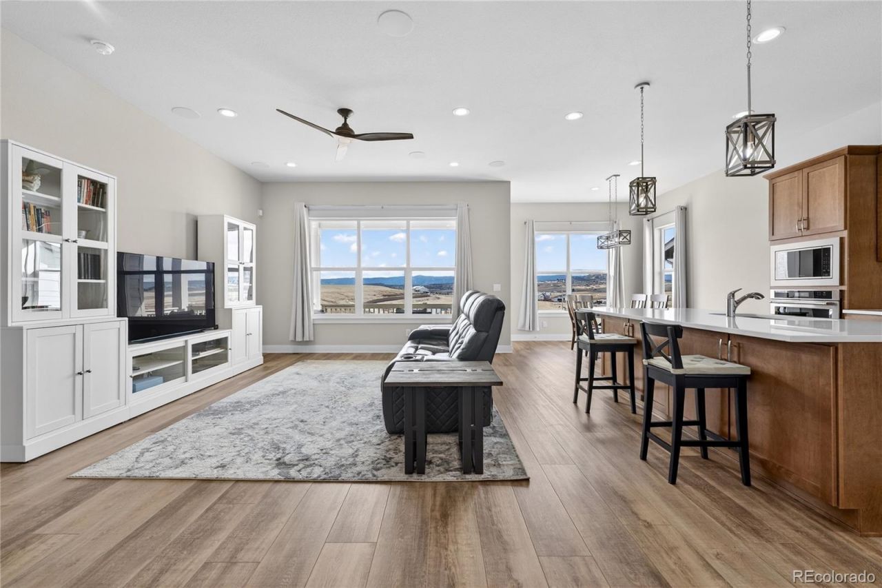 Set on a premium lot backing to open space, this brand-new ranch home offers breathtaking scenery in Castle Rocks premier 55+ active-adult resort-style community. From the moment you arrive, youll notice the thoughtful design and high-end finishes that define this exceptional home. Step inside to a light-filled interior where 10-foot ceilings, 8-foot doorways, and expansive windows create an airy, elevated feel, while stunning mountain views greet you upon entry and set the tone for a home designed to celebrate Colorados natural beauty. The open-concept layout features premium luxury vinyl plank flooring, built-in speakers with surround sound, and a seamless flow between spaces. The heart of the home is the sleek, modern kitchen, complete with stainless steel appliances, a gas cooktop with range hood, quartz countertops complemented by a cohesive backsplash, warm cabinetry with crown molding, and a spacious island. The living room invites you to relax while taking in the open space and mountain views, and the adjacent formal dining area provides an elegant setting for gatherings and special occasions. Tucked away for privacy, the primary suite is a peaceful retreat with serene views, dual walk-in closets, and a luxurious ensuite bath featuring dual sinks and a frameless glass shower. An additional bedroom and full bathroom near the front of the home offer comfort for guests, while a versatile bonus room provides flexible space for a home office, additional dining, or a cozy sitting room. Completing the home is a convenient mudroom with built-ins just off the attached two-car garage. Experience the vibrant lifestyle of Montaine, where life is meant to be lived with miles of trails, rolling terrain, star-filled skies, and resort-style amenities designed for connection, wellness, and recreation.