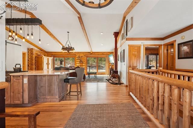 Welcome to this classic Colorado ranchette on 5 acres of fenced horse property with a stunning 3800 square foot log home in Pine Hills subdivision of Monument framed by sweeping views that capture exactly why people choose to live in Colorado. Enter this beautifully remodeled home with loads of light, hickory floors throughout and vaulted ceilings.The remodeled gourmet kitchen has it all with quartzite countertops, alder custom cabinets, stainless appliances, gas cooktop, walk in pantry and a massive island with beverage fridge. The great room/living room is open to the kitchen with free standing gas fireplace and access to the trex deck with southern exposure. The main floor primary bedroom and amazing remodeled 5 piece primary spa bath with fireplace is off of the living room. Also on this floor is the formal dining room (currently used as reading nook), guest 3/4 bath and another main floor bedroom that is currently used as a study. The lower level with lvp floors, family room with fireplace, built-ins, 2 additional bedrooms and 3/4 bath as well as laundry and storage.Outside is where this property really sets itself apart with the 4000 SF outbuilding built in 2021. The building is split evenly between a premium heated workshop and an attached indoor horse arena with electric, water and much more. There is also a 4 stall 2 story barn with water and electricity. All this 1/4 of a mile from Pike National Forest and loads of trail plus views from every part of the property. This place is an entire lifestyle whether you are an equestrian, car enthusiast, rv/boat owner, collector, hobbyist or just want some open space and room this peaceful residence has it all. This location can't be beat in desirable and convenient Monument offering the perfect blend of peaceful rural living with trails for hiking, biking and horseback riding outside your back door yet less than 12 minutes from I-25, shopping, restaurants and more with close proximity to Denver and Colo Springs.