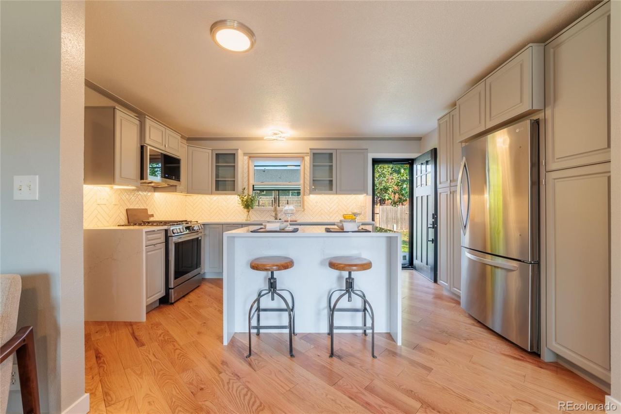 Fully renovated 4-bedroom home in Frederick with no HOA and no metro taxes. This property features extensive upgrades throughout, including all-new windows and interior and exterior doors, new interior and exterior paint, newer roof, new concrete extra-wide driveway, and extended rear patio.The remodeled kitchen includes high-end stainless steel appliances: gas range/stove, microwave, dishwasher, and refrigerator. Quartz countertops with waterfall edges including on the eat-in island. New cabinetry offers built-in pantry storage, glass door fronts, sleek drawer pulls, and under-cabinet lighting. Deep single-tub sink with integrated cutting board.Main level features new oak flooring, new carpet, new designer LED lighting, and a hardwood feature wall in the living room.Upstairs offers 3 bedrooms. The primary suite includes a private ensuite bathroom with frameless shower surround, zero-threshold entry, and waterfall shower head. Additional 3/4 bathroom on the main floor features updated vanity, sink, and tileHardwood stairs lead to the finished basement with family/rec room featuring a fireplace, versatile bonus area suitable for bar, craft, or workout space, fourth bedroom with egress window, and updated 1/2 bath with laundry room.East-facing backyard includes a full-width concrete patio and storage shed. Backs to Town of Frederick easement with no direct rear neighbors. Attached two-car garage with steel-finished walls, storage cabinetry, and included heater (not hooked up).Located near Fire Fighters Park, Downtown Frederick restaurants, coffee shops, REC Center, St. Vrain Schools, and convenient access to I-25 and Highway 85.
