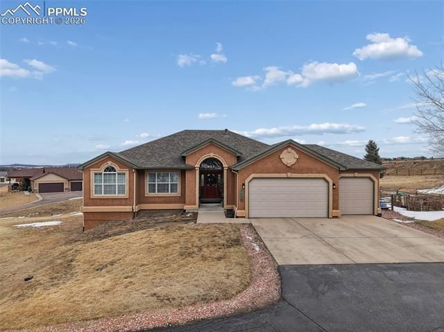 Well maintained and perched atop a hill with sweeping 360° views. Noticeable care and thoughtful updates show pride of ownership. Ultra clean home is stucco on the exterior, warm interior offers an open, light-filled floor plan with oak hardwood floors, dedicated office, designer lighting, and a gas fireplace with stone surround. Well-appointed kitchen with one-year-old Whirlpool appliances, bay-window breakfast nook with walk-out, main-level laundry, and bonus sitting area with views. Spacious primary suite features coffered shiplap ceiling, walk-in closet, and five-piece bath. Walk-out basement includes large rec room, three additional bedrooms, full bath, and access to patio with built-in propane grill. Three-car garage and central AC. Expansive partially covered deck. Hot tub, grill, fire pit, and chicken coop with chickens included.