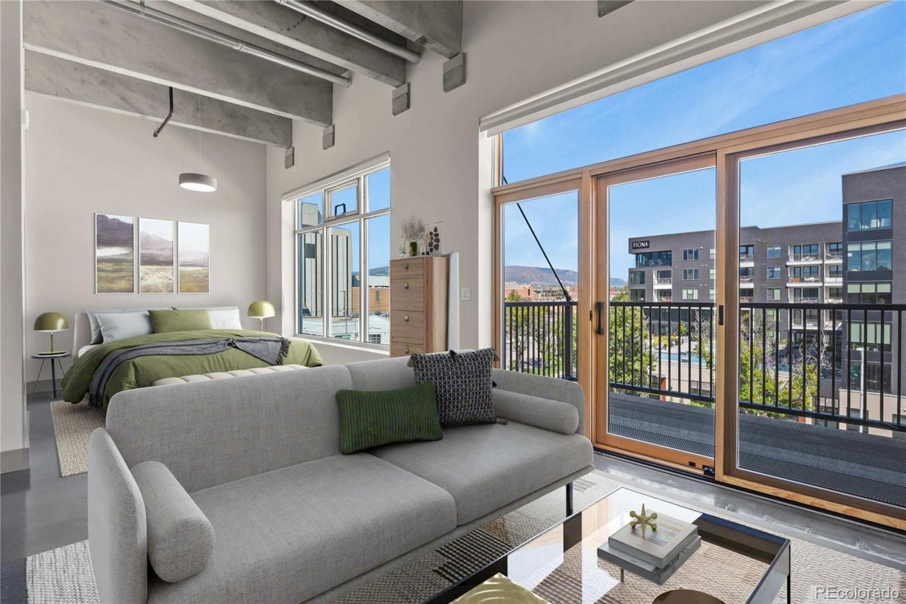 This top-floor loft combines modern finishes with industrial design and offers city and mountain views. True industrial feel with large expanse of windows and Pella sliding door leading to large private balcony. Exposed concrete ceilings, newly refinished concrete floors and exposed ductwork. The kitchen is designed with custom two-toned wood and acrylic cabinetry, quartz counters, large island, and GE stainless appliances including gas range. Generously sized bathroom features a double vanity with quartz counters, large walk-in shower with frameless glass door, and tile flooring. Youll find quality plumbing and lighting fixtures throughout with thoughtful upgrades that add comfort and functionality; blackout shades, custom closet shelving, fresh interior paint, and stackable washer and dryer. The building offers secure entry with elevator access, private covered parking, and on-site storage. HOA dues include ALL utilities and insurance! Centrally located downtown, with easy access to restaurants, shops, nearby parks, and entertainment.