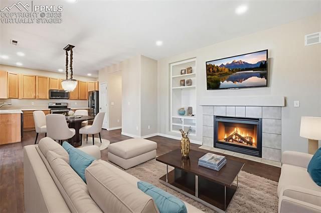 This well-maintained 3-bedroom, 2.5-bath home offers a functional layout and thoughtful features throughout. The main level opens to a spacious living room with vaulted ceilings and durable water-resistant laminate flooring. The kitchen includes black stainless-steel appliances, ample cabinet and counter space, and a pantry, and it connects directly to the dining area and family room. The family room features a gas fireplace, built-ins, and a large window for natural light. A half bath is conveniently located near the staircase. Adjacent to the kitchen is a sunroom with two built-in storage closets and access to the backyard, which includes a covered patio and storage shed. All three bedrooms are located upstairs. The primary bedroom offers a deep closet and an attached bath with a generous vanity. The two additional bedrooms share a full bathroom, and the laundry area is also on this level. Additional features include a 2-car garage, central air, and a lot that backs to Sand Creek with an adjacent walking trail. The property is close to schools, shopping, and provides easy access to Powers Boulevard, Colorado Springs Airport, and Peterson Air Force Base.