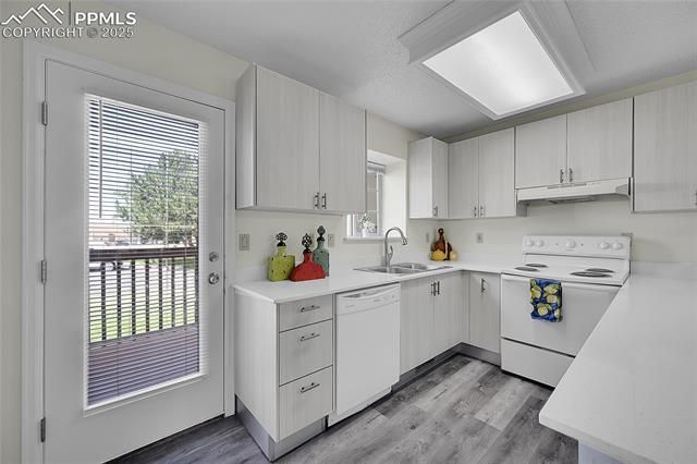 Westside Charmer ~ Fall in love with this updated home in a convenient location just off Woodman & I-25 on the North end of Colorado Springs. This spacious 2-story is nestled in the highly desirable Rockrimmon neighborhood featuring 2 bedrooms, 2.5 bathrooms, an updated kitchen, and a walkout basement. Enjoy fresh interior paint, newer carpeting, spacious vaulted ceilings, skylights, six-panel doors, a kitchen pantry, and ceiling fans throughout. The comfortable living room boasts a cozy gas fireplace, while the open dining area is perfect for gatherings. The light & bright kitchen shines with new flooring, new white cabinets, a new faucet, and new quartz countertops. Two spacious bedrooms upstairs, both featuring adjoining bathrooms. Both bedrooms and upstairs bathrooms boast vaulted ceilings & skylights to lower electric costs. Walkout basement with sliding glass door leaves room to create your perfect oasis! Laundry hook ups and plumbing available in basement for a possible 4th bathroom, 3rd bedroom or additional living space, if desired. Step outside to unwind on your wood deck, relax on the peaceful covered concrete patio with extra storage space, or connect with neighbors at the community outdoor pool. Fully-fenced yard space for pets. Dream up endless finishes to create your ideal space with the unfinished walkout basement. ***(Water, trash and snow removal services are included.)***