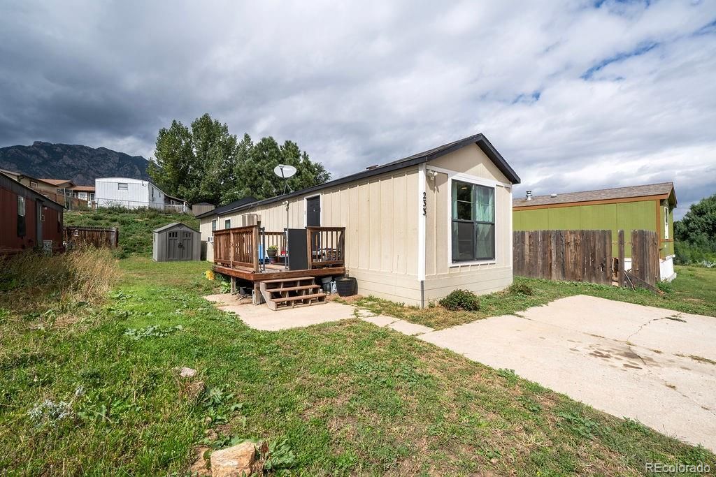 Turnkey, 3BR, 1BA, single-wide mobile home nestled in Colorado Springs at the base of Cheyenne Mountain State Park and a short distance from Fort Carson. This beautifully remodeled home has been thoughtfully updated. Newer siding and roof. Light and bright, open floor plan with lots of windows that flood the home with natural sunlight. Attractive tiled floors through the Living Room, Dining Area, and Kitchen. The Kitchen features an island with breakfast bar, cabinets with convenient pull-out shelving, custom concrete countertops, and a stylish tile backsplash. Stainless steel appliances include a dishwasher, smooth top range oven, built-in microwave, and refrigerator. The Kitchen flows seamlessly into the Dining Room/Living Room. Three spacious, carpeted Bedrooms share a Full Bathroom. The Primary Bedroom has a lighted ceiling fan and window A/C unit for year round comfort. The Full Bathroom features a modern light fixture, a custom shower window, and washer/dryer for added convenience. Step outside to enjoy relaxation and the Colorado sunshine on the side deck. The fenced backyard includes a storage shed perfect for tools and toys. Concrete pad for 2-car parking. Located in Cheyenne Mountain Estates, a welcoming family neighborhood with a park and community swimming pool. This delightful home is MOVE-IN READY and waiting for you to call it home! Dont miss your chance to own this stunning home?schedule a viewing today!