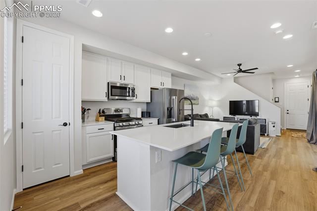 Beautifully upgraded townhome in North Colorado Springs! The main level features a bright, open layout between the Living Room, Dining area, and Kitchen, with a covered porch boasting large glass sliding doors. The Kitchen has quartz countertops, upgraded cabinetry, and is wired for pendant lights. The adjoining living room is wired for surround sound. A powder room finishes off the main level. Upstairs is a stackable laundry, conveniently located near the generously sized bedrooms. You'll love the Primary Bedroom, with a spacious walk-in closet and private en-suite bathroom! Ceiling Fans, Norman Blinds, and a tankless water heater finish off the house! The house is pre-wired for a security system. HOA fees are low (especially for a townhouse in the Briargate Area). The HOA takes care of all landscaping, snow Removal, and trash removal.