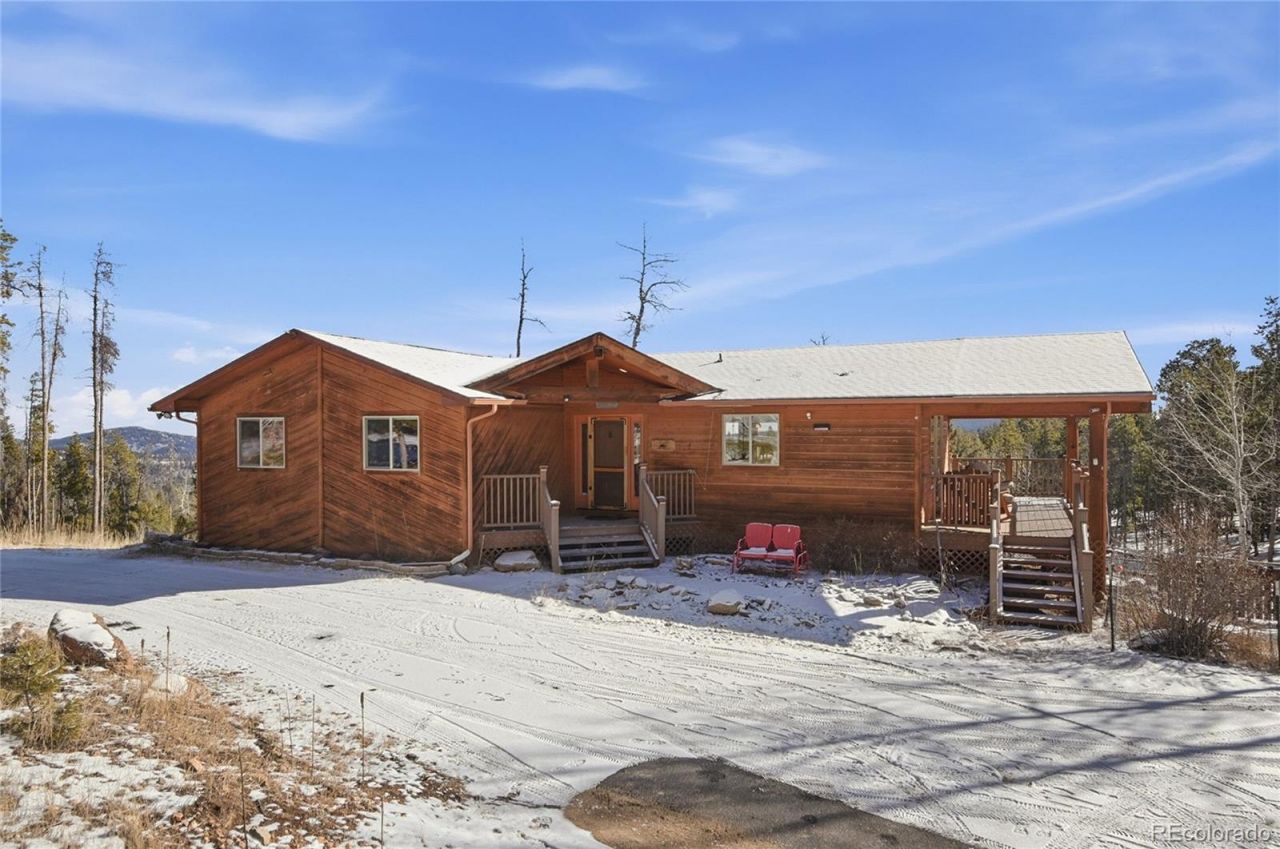 Tucked into 5.45 private acres in Shadow Mountain, this mountain contemporary retreat offers true one level living with beautiful mountain views and the kind of peace you feel the moment you arrive. Inside, the open floorplan is wrapped in warmth with tongue and groove ceilings, vaulted spaces, alder cabinetry, granite counters, and a spacious kitchen island designed for gathering. Large windows flood the great room with natural light and frame forested views in every direction. A gas fireplace anchors the living area, creating the perfect setting for snowy evenings or cool mountain mornings. New flooring runs throughout the home, and central air conditioning, a rare luxury in this area, keeps summers comfortable. The whole home Generac system adds confidence year round. With three bedrooms and two baths all on one level, daily living is effortless and accessible. Step outside onto the composite wraparound decking and enjoy the privacy that only acreage can provide. You cannot see neighboring homes, just trees, sky, and abundant wildlife that regularly wander through. A small spring fed pond adds to the natural charm, while thoughtful fire mitigation provides peace of mind. The oversized detached garage offers two spaces plus additional work area in the third bay, with ample off street parking and dedicated RV space for all your mountain toys. If you have been searching for privacy, functionality, and modern comfort in the foothills, this property delivers all three in one beautifully maintained package.