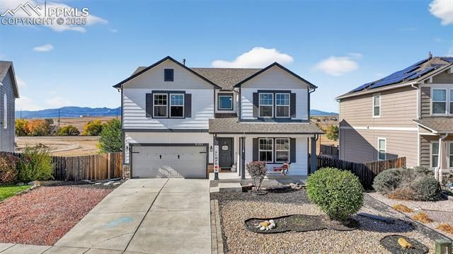 Welcome to this beautifully maintained two-story home in the desirable Cuchares Ranch community, offering 3 bedrooms, 3 bathrooms, and 3,884 total square feet with stunning views of the Front Range and Pikes Peak! The bright and open floor plan features a spacious living area that flows seamlessly into the kitchen and dining space—perfect for entertaining or family gatherings. The kitchen is equipped with newer stainless-steel appliances, a large pantry, and ample counter space. Upstairs you’ll find a generous primary suite with a walk-in closet and en-suite bath, along with two additional bedrooms, a full bath, and a convenient laundry room. A large upper-level loft provides a flexible second living space, ideal for a media room, home office, or play area. Downstairs, the unfinished basement offers nearly 1,300 square feet ready for your personal touch—finish it to add more bedrooms, a rec room, or workout area. Major mechanical updates include a newer furnace, water heater, and water softener for peace of mind. Step outside to enjoy the fenced backyard with mountain views, a patio for relaxing or barbecuing, and room for pets or play. The attached two-car garage offers extra storage and convenience. Located just minutes from military installations, schools, shopping, and dining, this home combines space, comfort, and location in one incredible package. Experience the best of Colorado living with room to grow and views you’ll love coming home to every day!